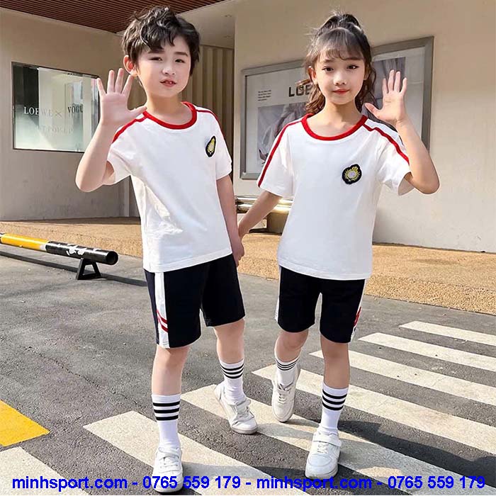 - Tên sản phẩm: Mẫu Đồng Phục Mầm Non Cổ Tròn Màu Trắng Viền Đỏ Đẹp MN023