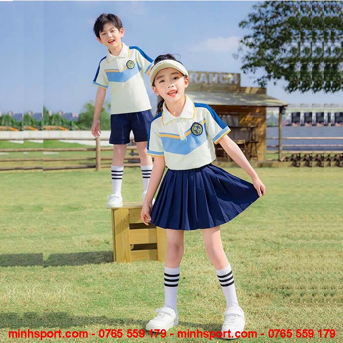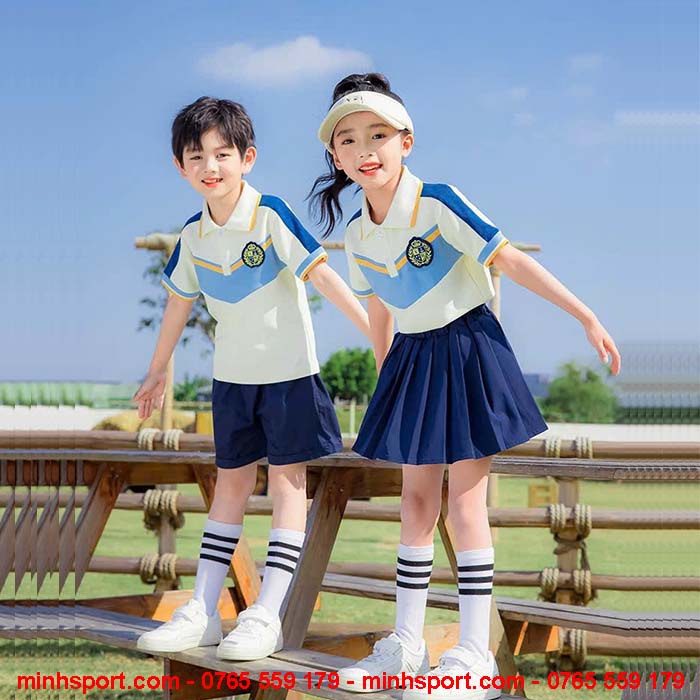 - Kiểu may: Áo thun có cổ + Quần short + Váy xếp ly