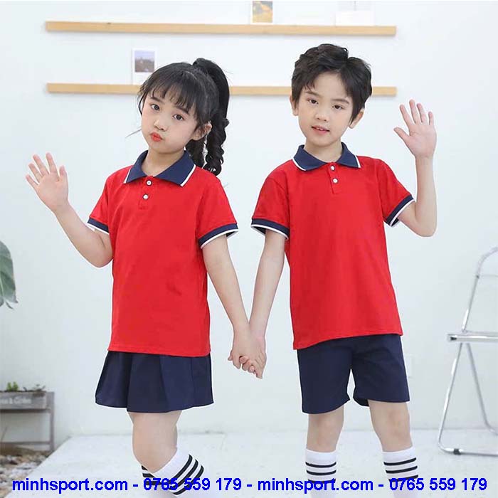 Mẫu Đồng Phục Mầm Non Polo Màu Đỏ Cổ Xanh Đen Đẹp MN022
