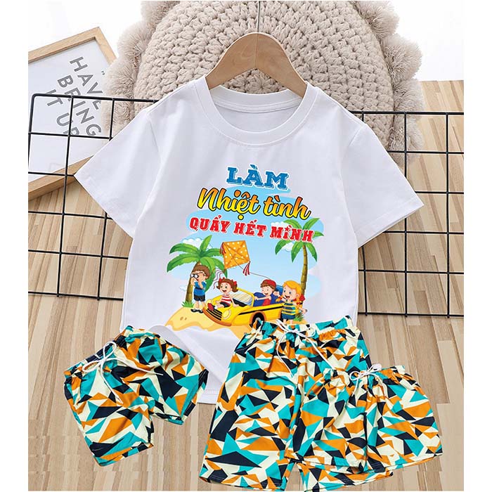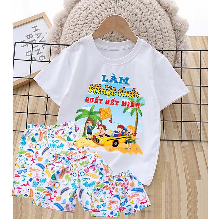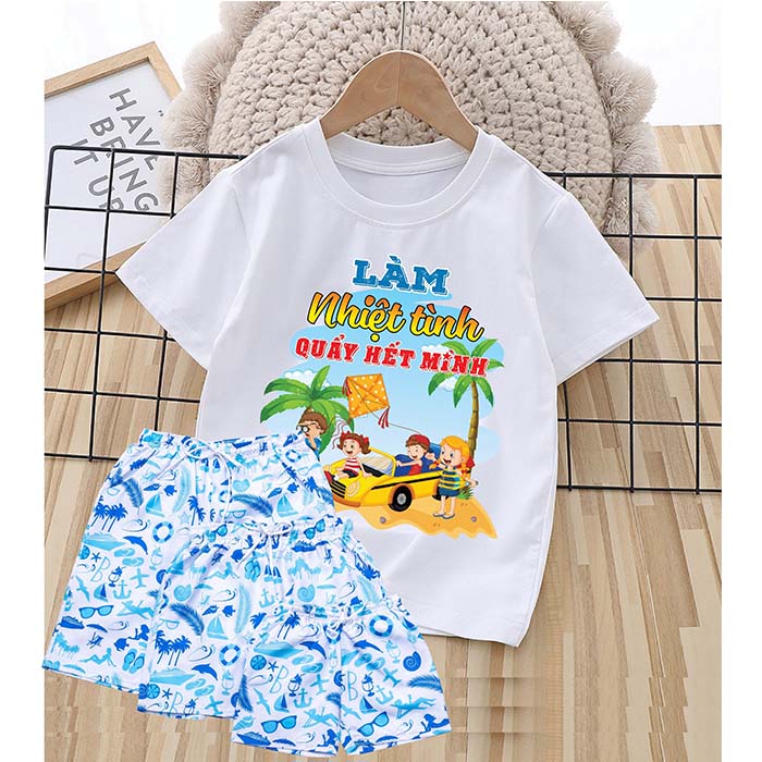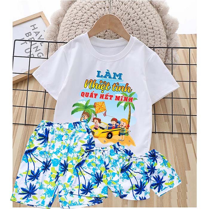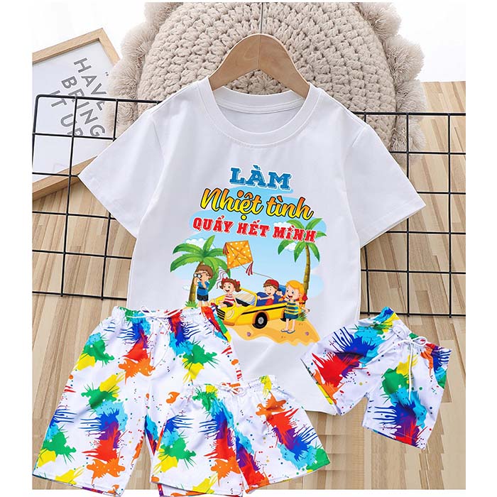 - Kiểu may: áo thun cổ tròn + quần short đi biển
