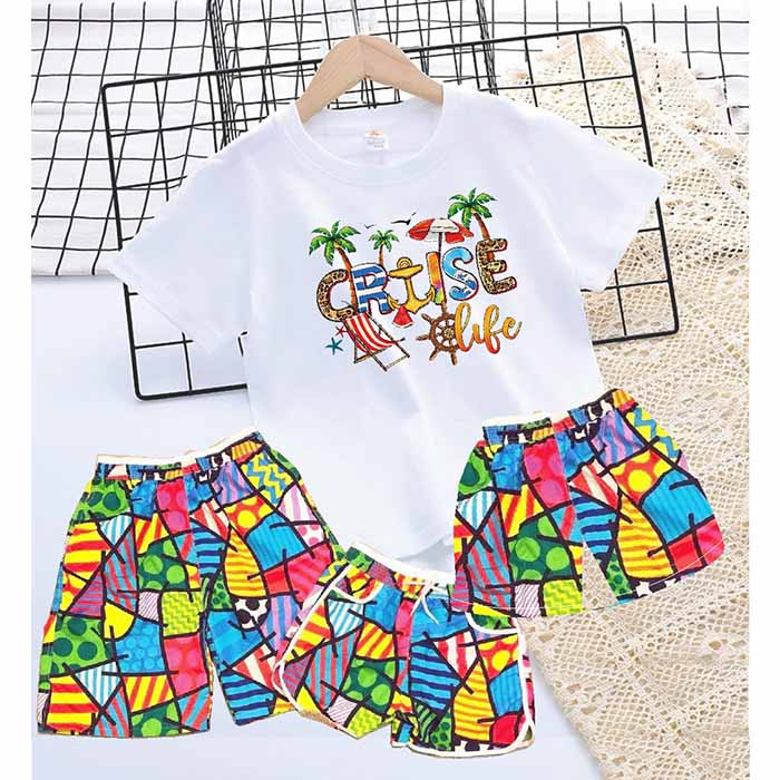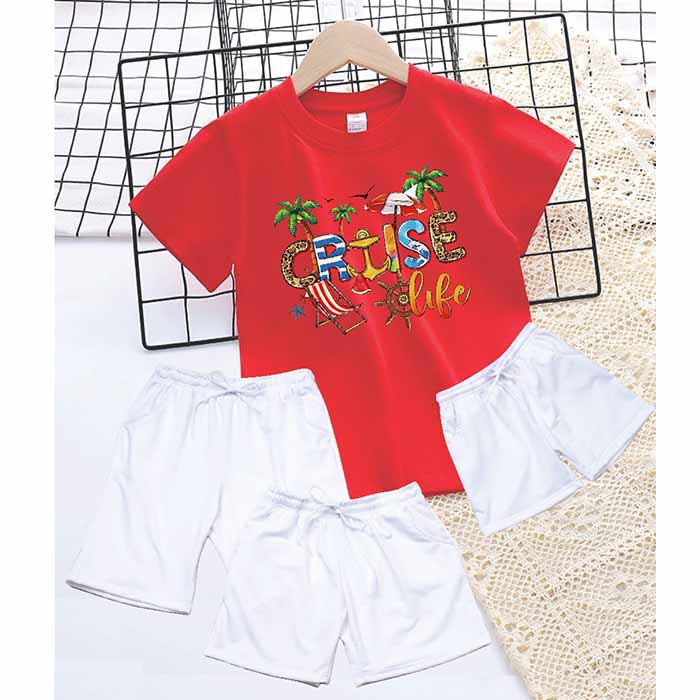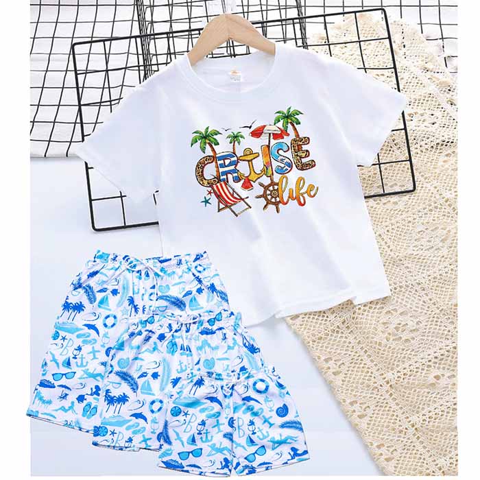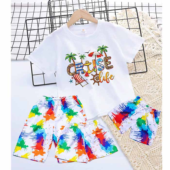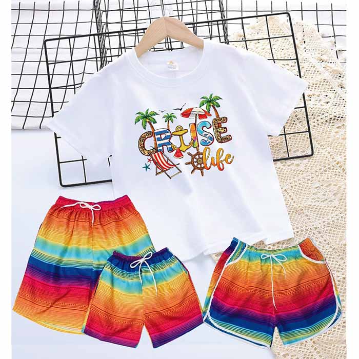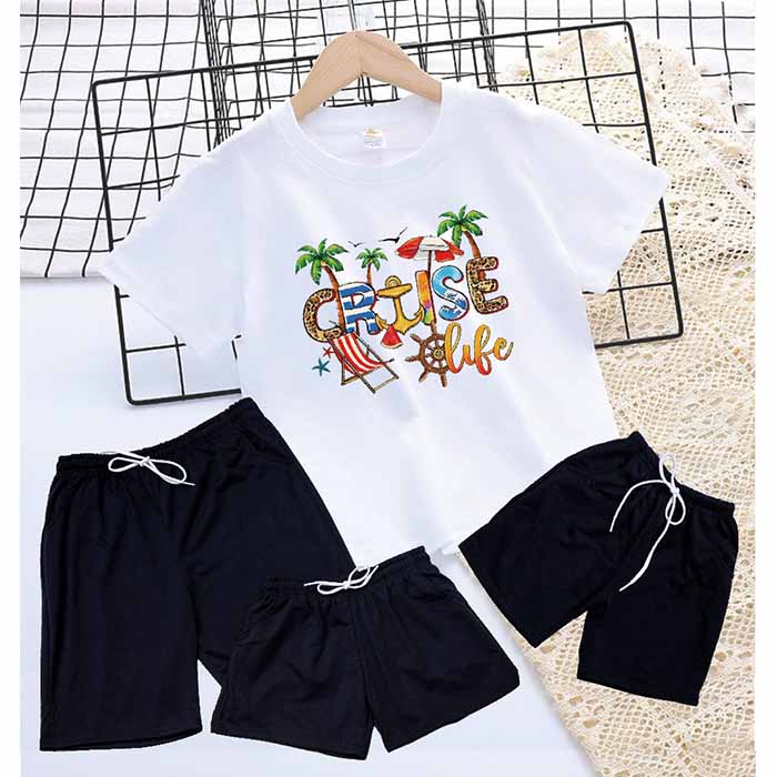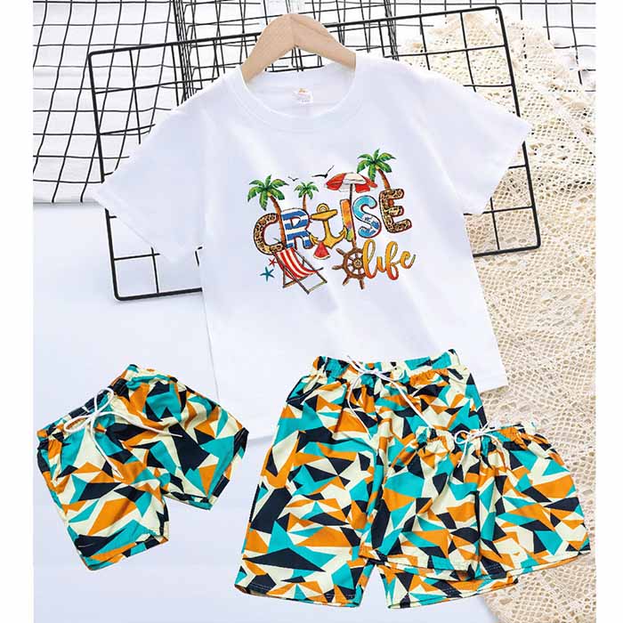 - Kiểu may: áo thun cổ tròn + quần short đi biển